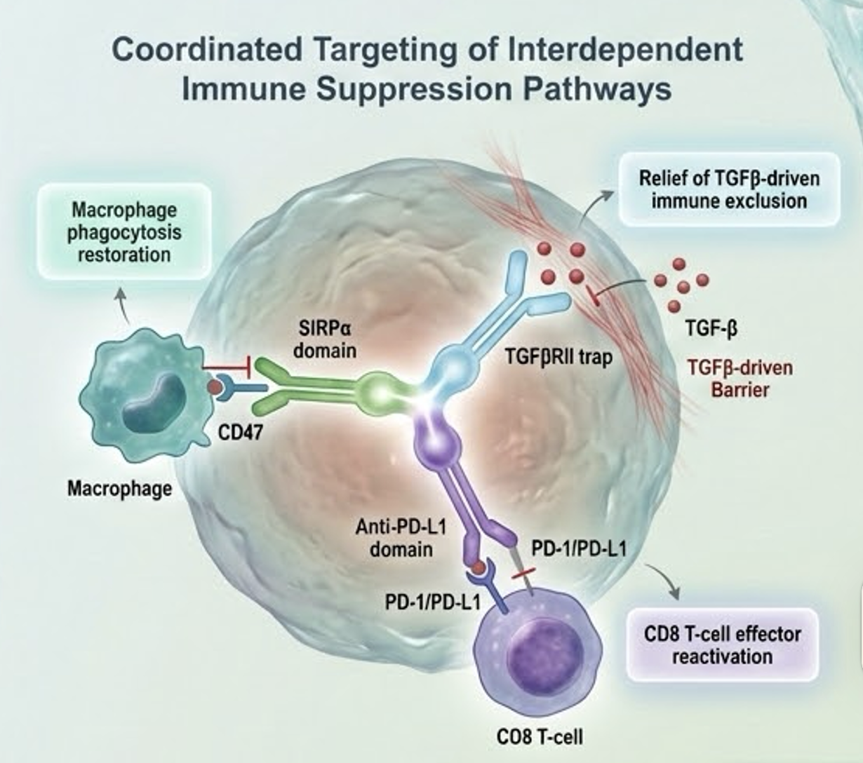 HCB301 is a tri-specific Fc-fusion protein engineered using HanchorBio’s FBDB™ platform to simultaneously modulate SIRPα, PD-L1, and TGF-β pathways within the tumor microenvironment. By coordinating innate immune activation, adaptive checkpoint inhibition, and stromal modulation in a single molecule, HCB301 is designed to address multi-compartment immune resistance while maintaining structural control over hematologic safety parameters.